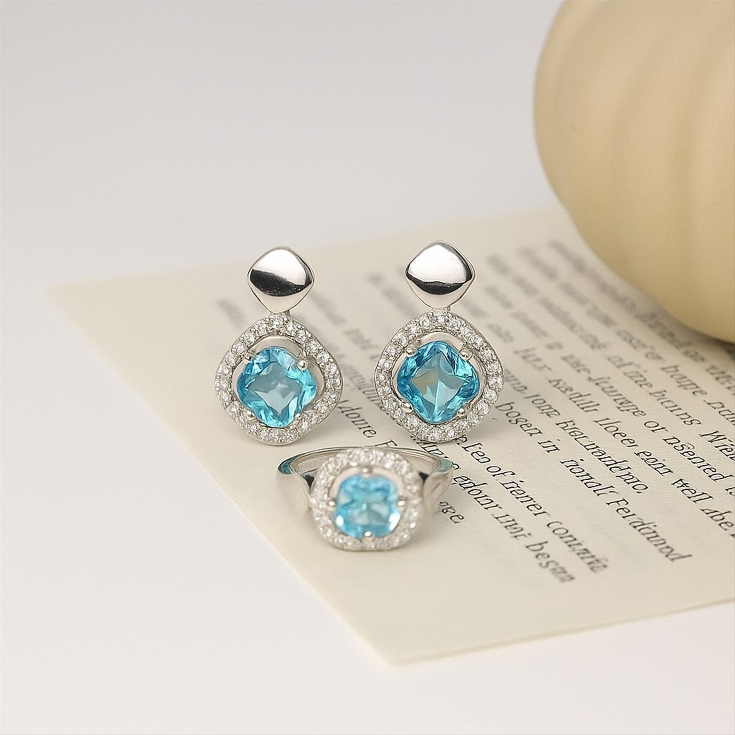 Комплект ювелирной бижутерии коллекция "Дубай" серьги и кольцо 19 р, покрытие посеребрение, вставка: цирконы и фианиты, цвет: прозрачный и голубой, арт.007.204-19