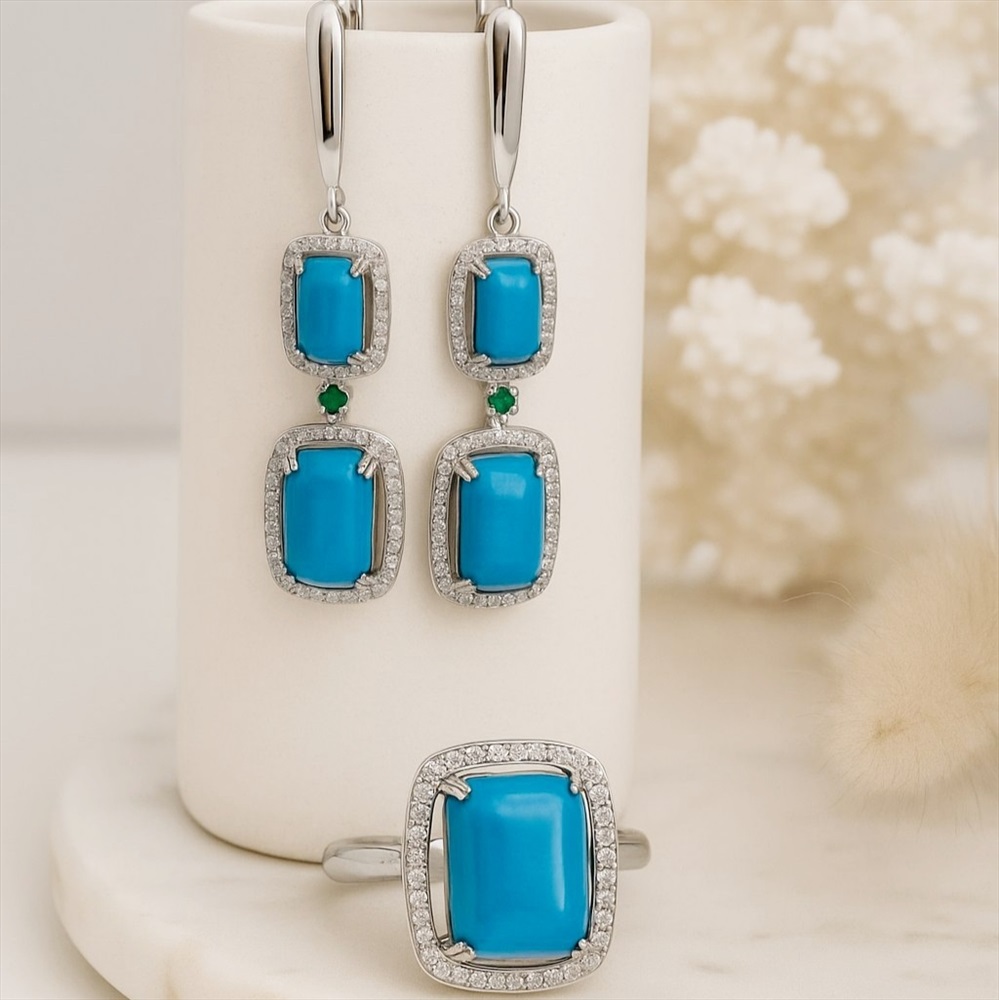 Комплект ювелирной бижутерии серьги и кольцо 18 р, покрытие посеребрение, вставка: фианиты и искусственный камень, цвет: бирюзовый и прозрачный, Уценка, арт.08.4037-18 (313.158-18) 2 фото