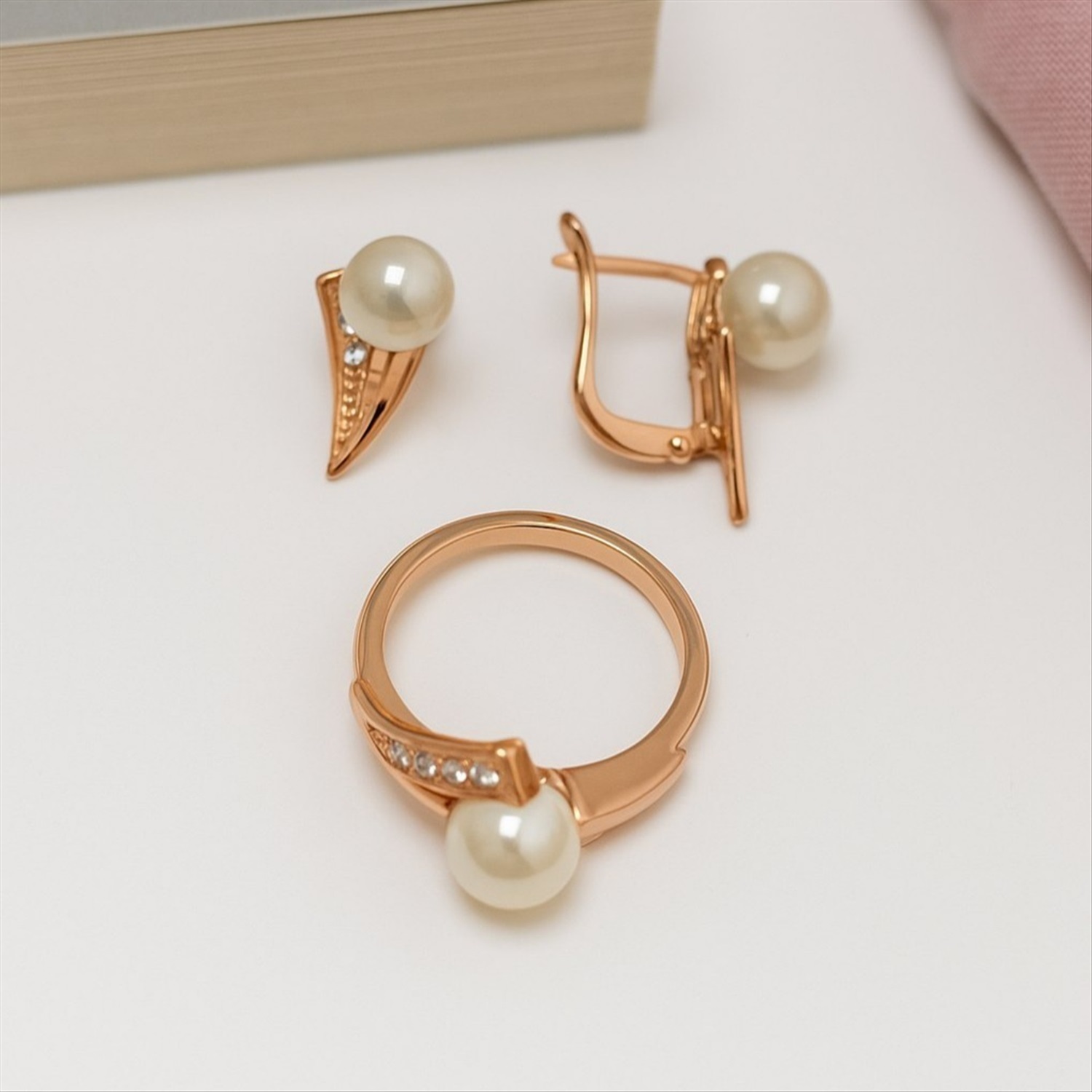 Комплект ювелирной бижутерии коллекция "Дубай" серьги и кольцо 20 р, покрытие позолота, вставка: искусственный жемчуг и фианиты, арт.007.203-20