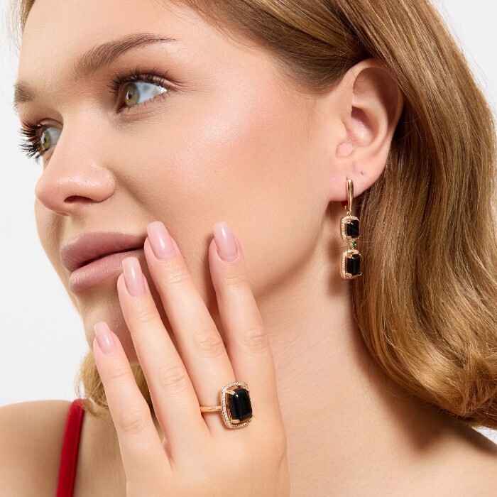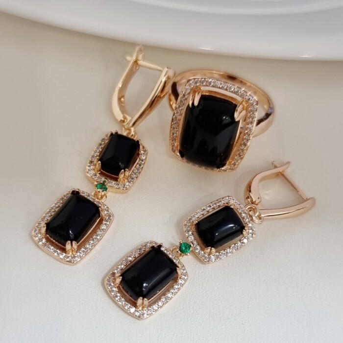 Комплект ювелирной бижутерии коллекция "Дубай" серьги и кольцо 18 р, покрытие позолота, вставка: фианиты и искусственный камень, цвет: черный и прозрачный, Уценка, арт.08.4049-18 (313.162-18 (1) 2 фото