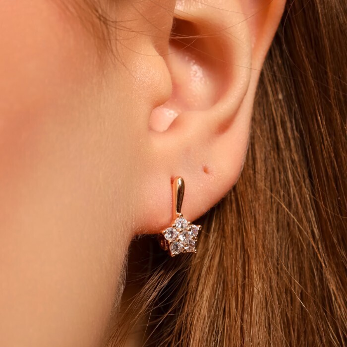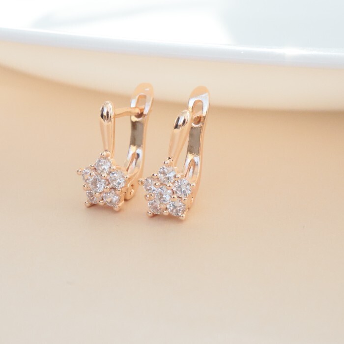 Серьги цветы ювелирная бижутерия коллекция "Дубай", покрытие позолота, вставка: фианиты, цвет: прозрачный, Уценка, арт.08.4043 (213.589) 2 фото