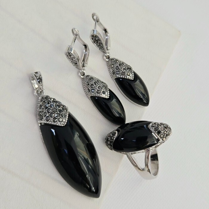 Комплект ювелирной бижутерии коллекция "Дубай" серьги, кулон и кольцо 19 р, покрытие посеребрение, вставка: пластик и марказиты, цвет: черный и графитовый, Уценка, арт.08.4034-19 (314.978-19) 2 фото