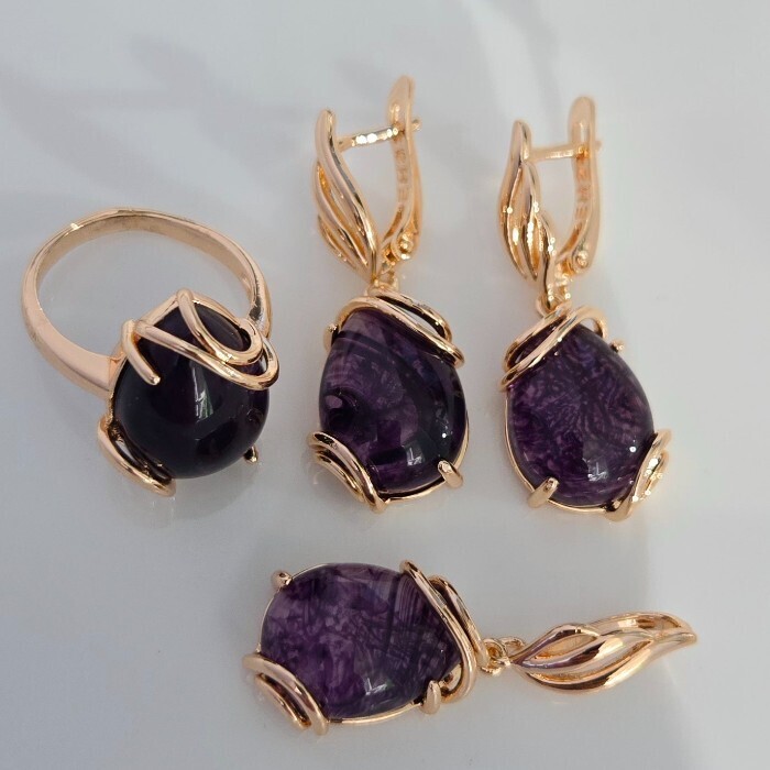 Комплект ювелирной бижутерии коллекция "Дубай" серьги, кулон и кольцо 18 р, покрытие позолота, вставка: искусственный камень фиолетового цвета,Уценка,  арт.08.3598-18 (314.803-18) 2 фото