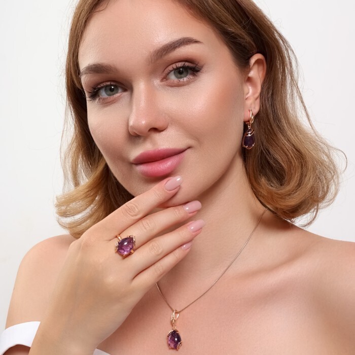 Комплект ювелирной бижутерии коллекция "Дубай" серьги, кулон и кольцо 17 р, покрытие позолота, вставка: искусственный камень фиолетового цвета,Уценка,  арт.08.3597-17 (314.803-17) 2 фото