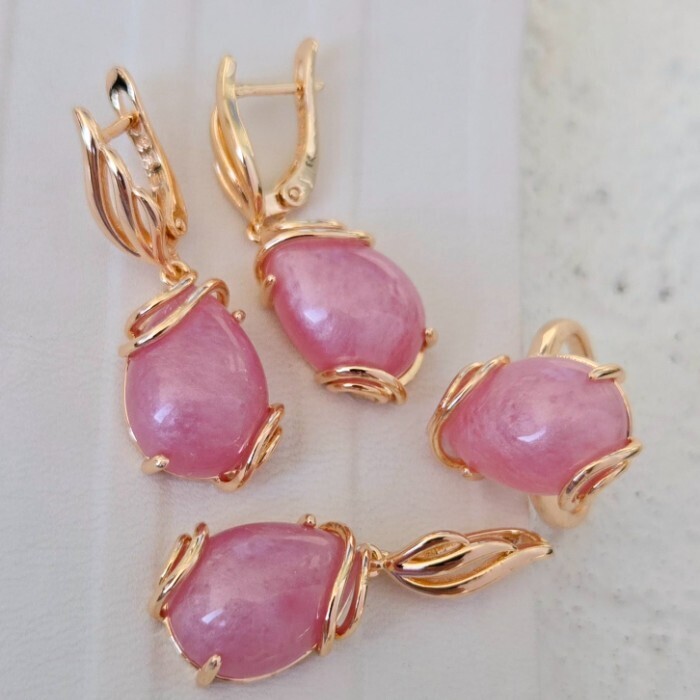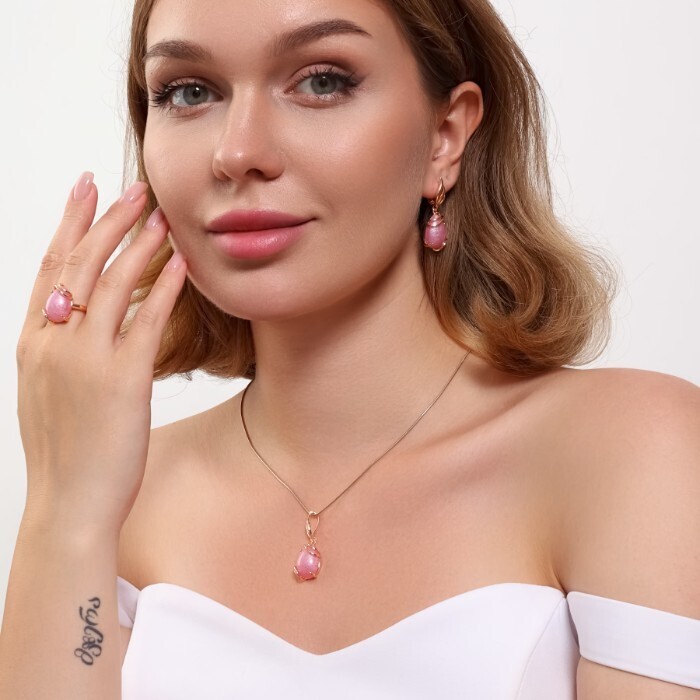 Комплект ювелирной бижутерии коллекция "Дубай" серьги, кулон и кольцо 18 р, покрытие позолота, вставка: искусственный камень розового цвета, Уценка. арт.08.3603-18 (314.801-18) 2 фото