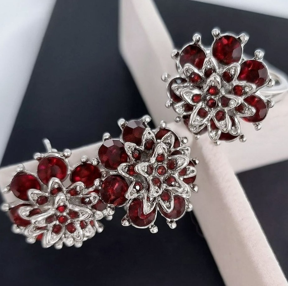 Комплект ювелирной бижутерии серьги, кулон и кольцо 18 р, покрытие: посеребрение, вставка: фианит и искусственный камень, цвет: бордовый и графитовый,Уценка, арт.08.3804-18 (314.281-18) 2 фото