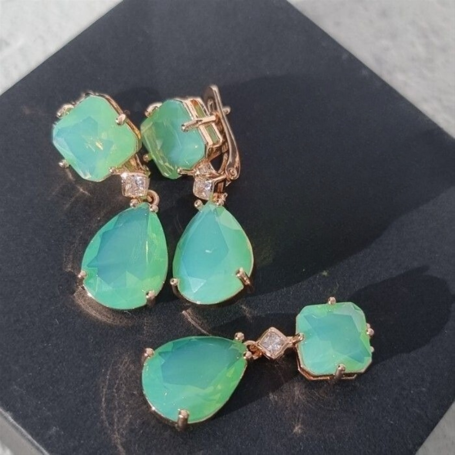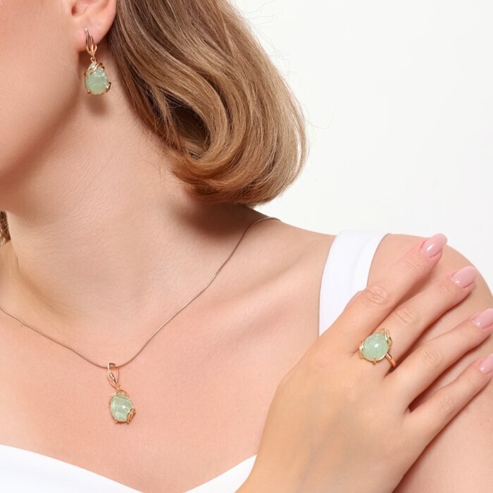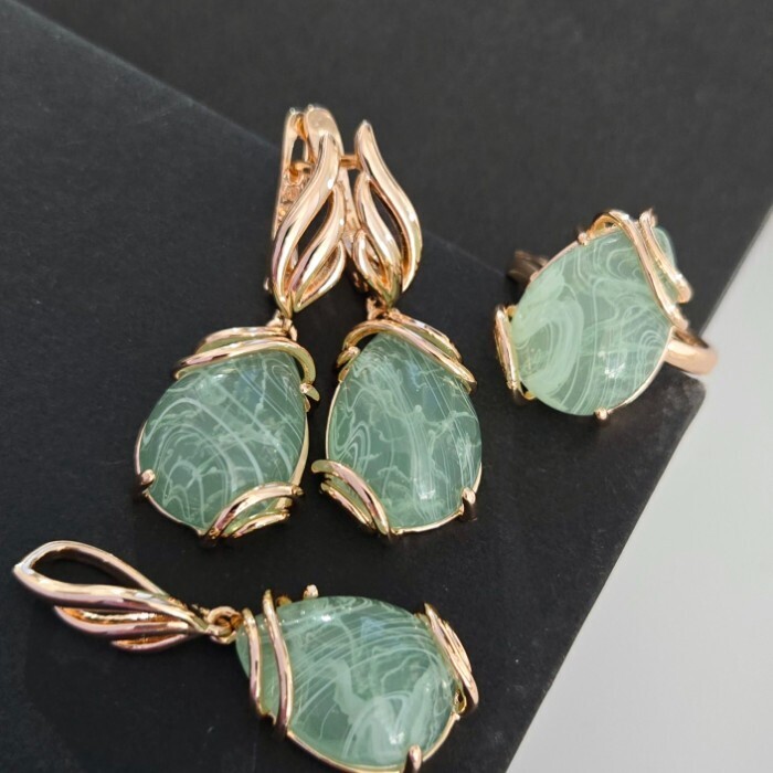Комплект ювелирной бижутерии коллекция "Дубай" серьги, кулон и кольцо 18 р, покрытие позолота, вставка: искусственный камень мятного цвета, Уценка, арт.08.3604-18 (314.806-18) 2 фото