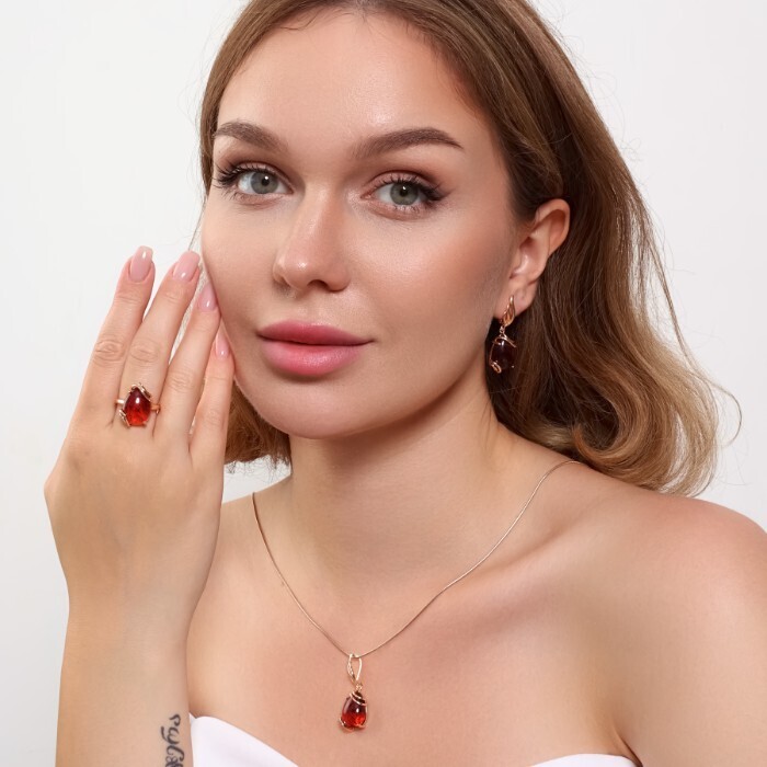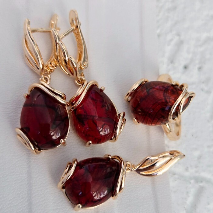 Комплект ювелирной бижутерии коллекция "Дубай" серьги, кулон и кольцо 17 р, покрытие позолота, вставка: искусственный камень бордового цвета,Уценка,  арт.08.3601-17 (314.804-17) 2 фото