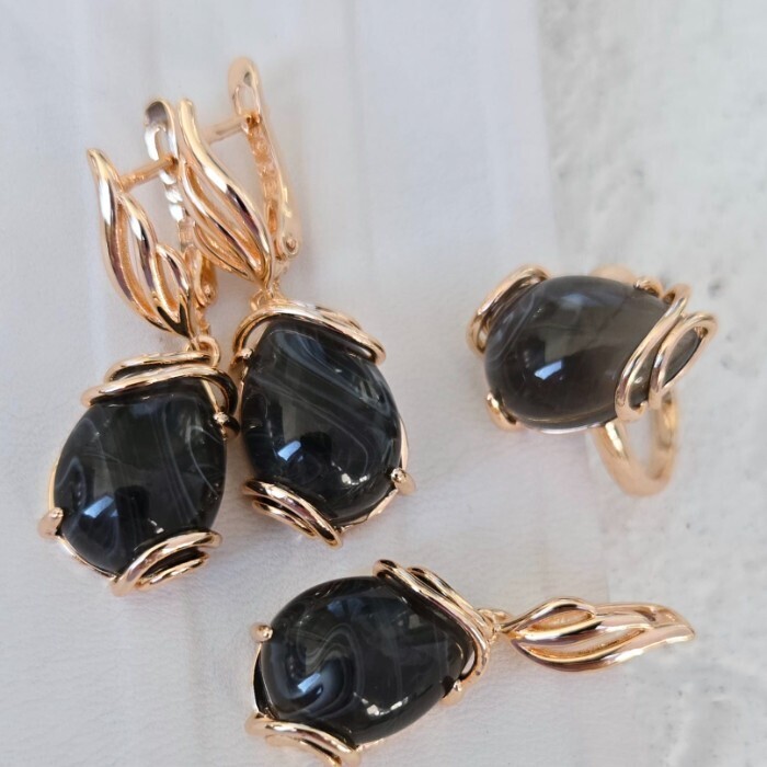 Комплект ювелирной бижутерии Дубайское золото: серьги и кулон с крупным камнем, покрытие позолота, вставка: фианит, цвет: черный, арт.414.041