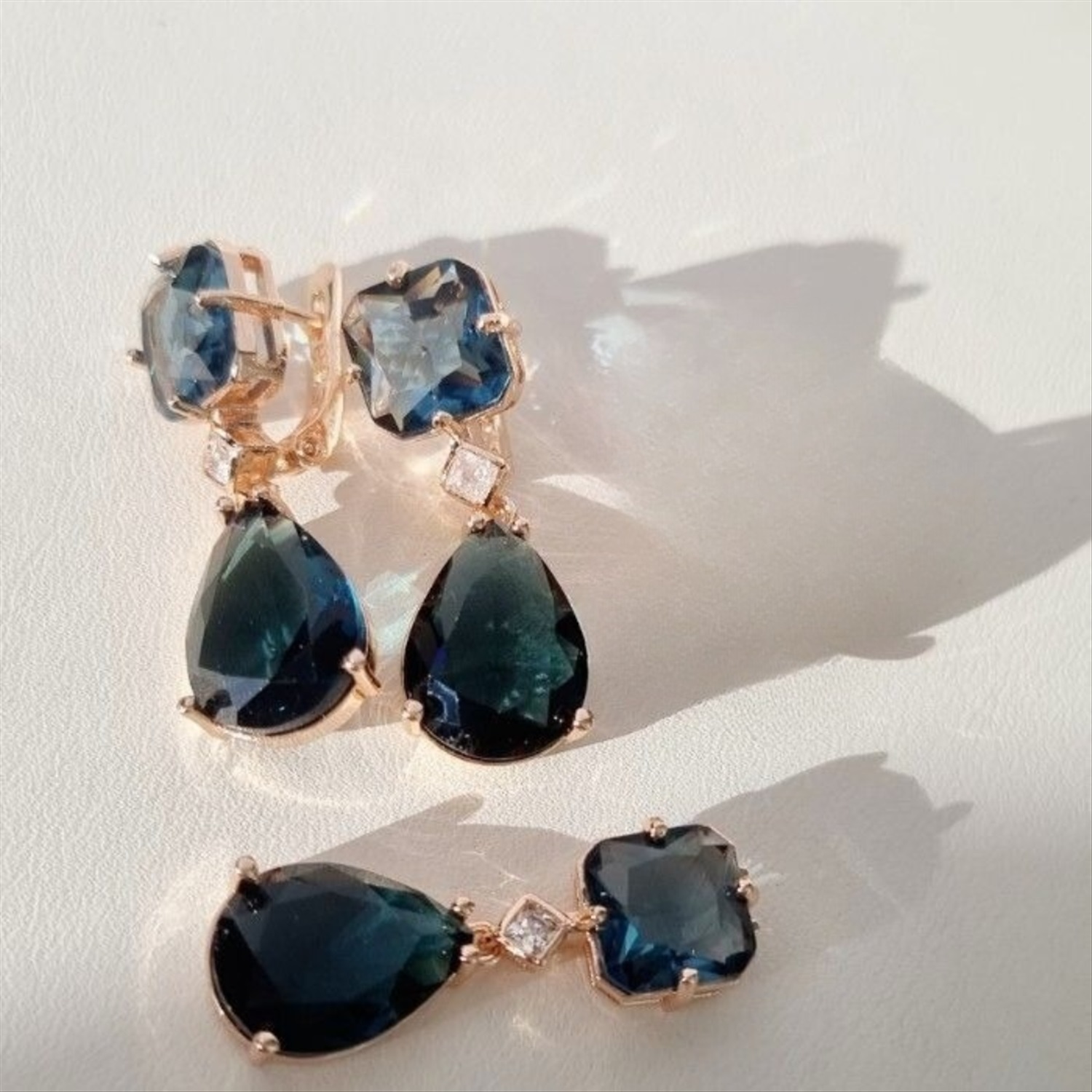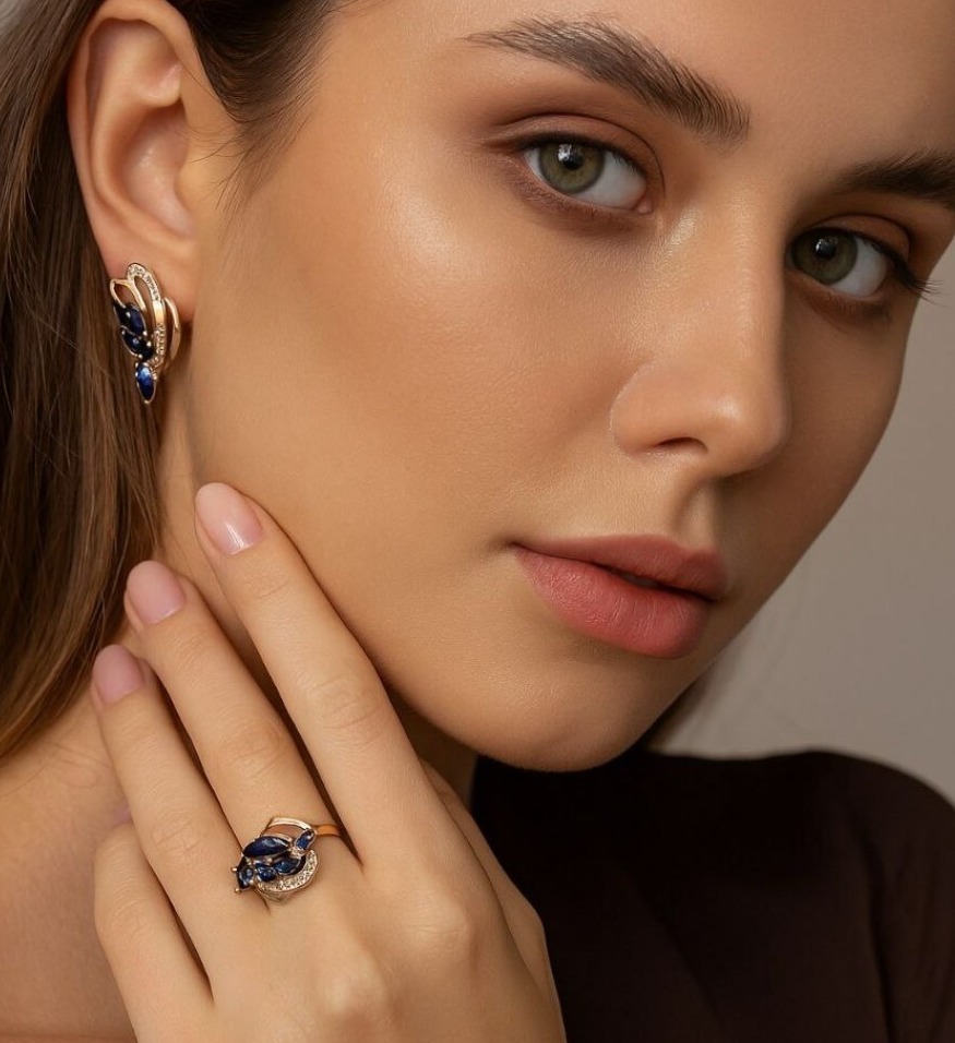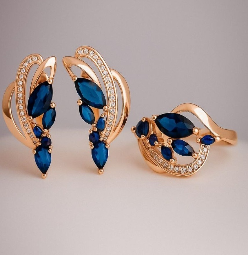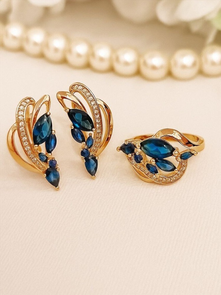 Комплект ювелирной бижутерии Дубайское золото покрытие позолота, серьги и кольцо 17 р, вставка: фианиты, цвет: темно синий и прозрачный, арт.414.096-17 3 фото