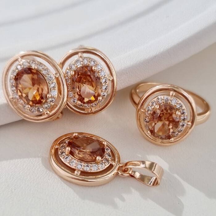 Комплект ювелирная бижутерия коллекция  "Дубай" серьги, кулон и кольцо 18 р, покрытие: позолота, вставка: фианиты, цвет: прозрачный и песочный, Уценка, арт.08.3809-18 (213.775-18)