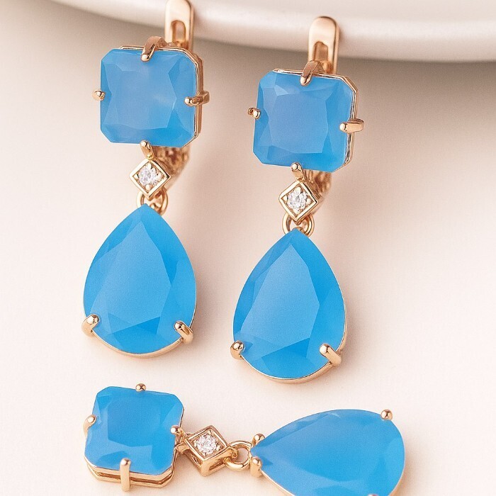 Комплект ювелирной бижутерии Дубайское золото: серьги и кулон с крупным камнем, покрытие позолота, вставка: фианит, цвет: голубой, арт.414.038