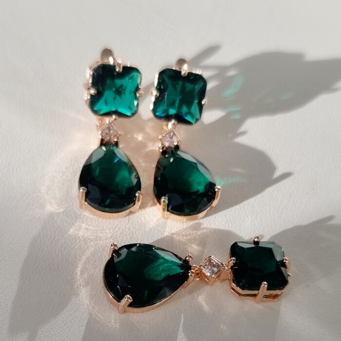 Комплект ювелирной бижутерии Дубайское золото: серьги и кулон с крупным камнем, покрытие позолота, вставка: фианит, цвет: изумрудный, арт.414.034