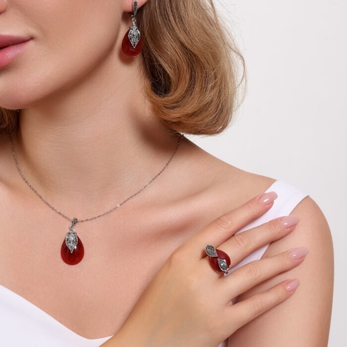 Комплект ювелирной бижутерии серьги, кулон и кольцо 18 р, покрытие: посеребрение, вставка: фианит и искусственный камень, цвет: бордовый и графитовый, Уценка, арт.08.3594-18 (314.808-18) 2 фото