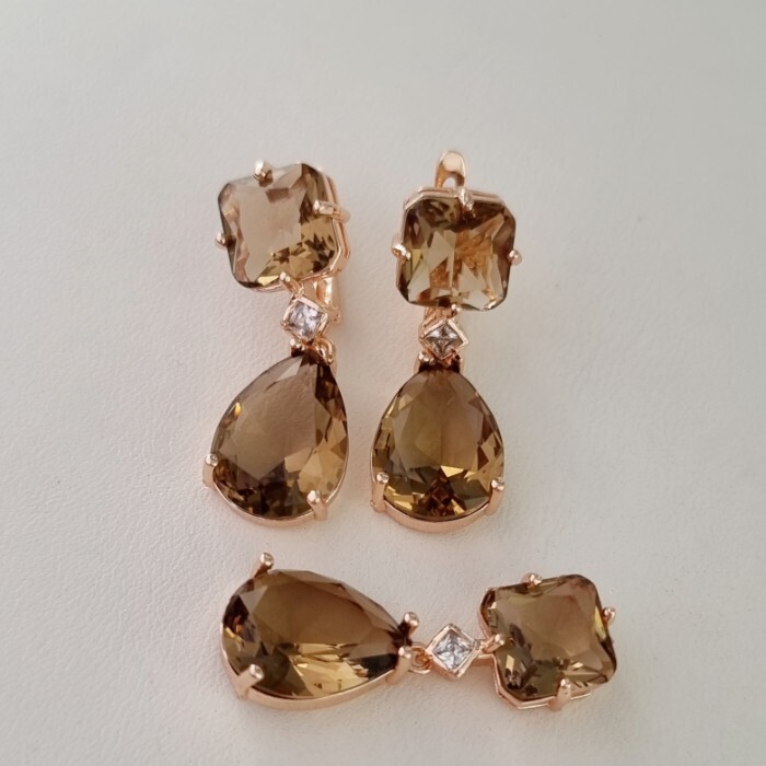 Комплект ювелирной бижутерии Дубайское золото: серьги и кулон с крупным камнем, покрытие позолота, вставка: фианит, цвет: коричневый, арт.414.039