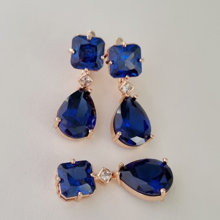 Комплект ювелирной бижутерии Дубайское золото: серьги и кулон с крупным камнем, покрытие позолота, вставка: фианит, цвет: сапфировый, арт.414.040