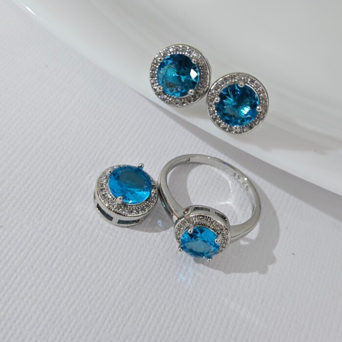 Комплект ювелирной бижутерии серьги, кулон и кольцо 17 р, покрытие посеребрение, вставка: фианиты, цвет: голубой и прозрачный, арт.313.257-17