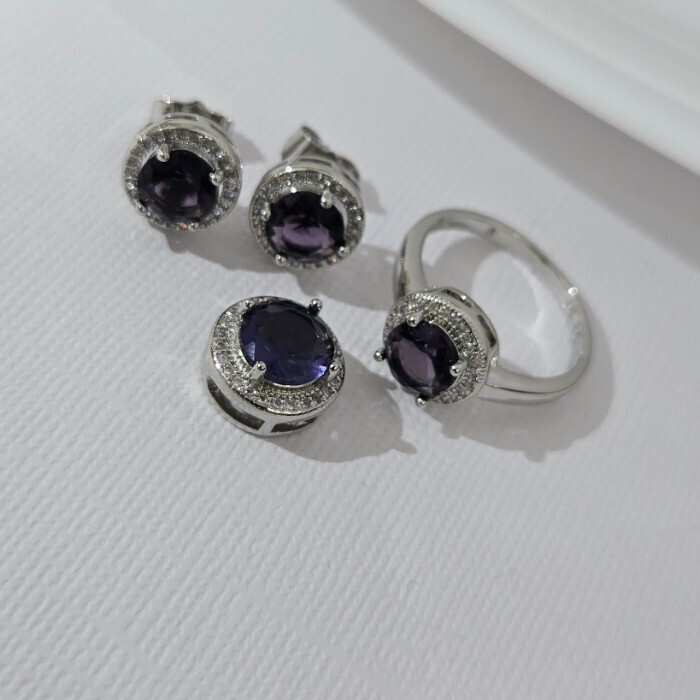 Комплект ювелирной бижутерии серьги, кулон и кольцо 17 р, покрытие посеребрение, вставка: фианиты, цвет: фиолетовый и прозрачный, арт.313.256-17