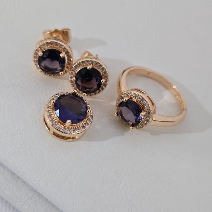 Комплект ювелирной бижутерии коллекция "Дубай"серьги, кулон и кольцо 17 р, покрытие позолота, вставка: фианиты, цвет: фиолетовый и прозрачный, арт.313.261-17 4 фото