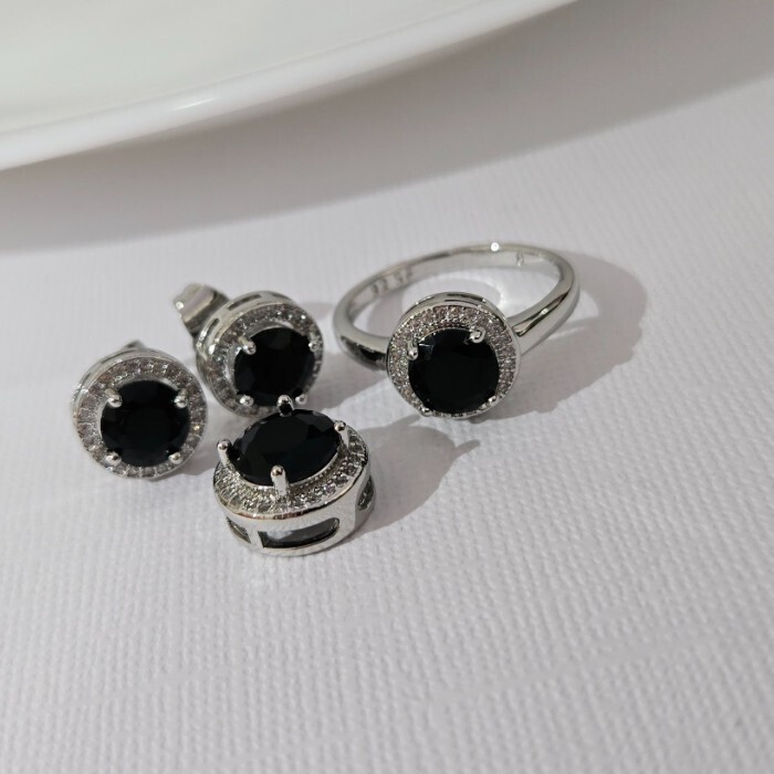 Комплект ювелирной бижутерии серьги, кулон и кольцо 17 р, покрытие посеребрение, вставка: фианиты, цвет: черный и прозрачный, арт.313.252-17