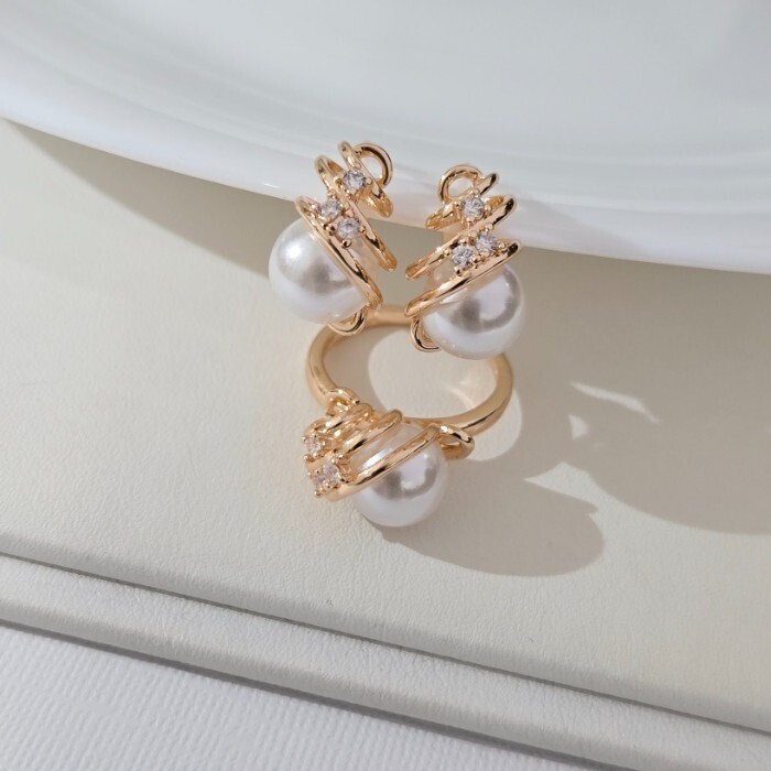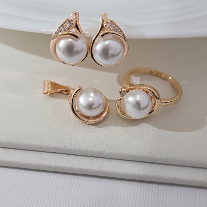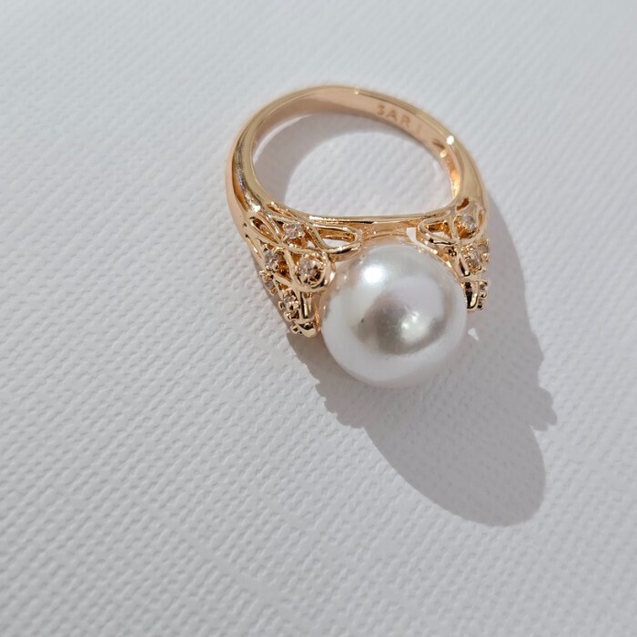 Комплект ювелирная бижутерия коллекция  "Дубай" серьги и кольцо 18 р, покрытие: позолота, вставка: искусственный жемчуг и фианиты, цвет: прозрачный и жемчужный, арт.313.289-18 3 фото