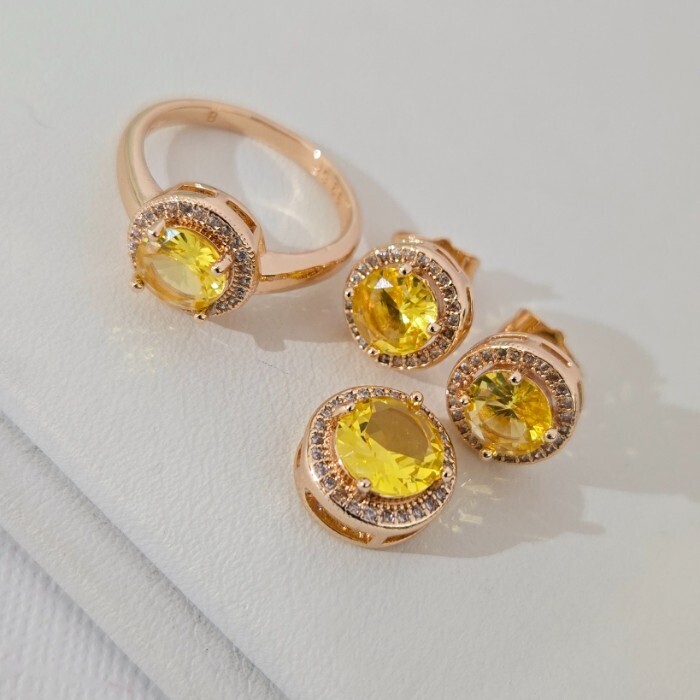 Комплект ювелирной бижутерии коллекция "Дубай"серьги, кулон и кольцо 17 р, покрытие позолота, вставка: фианиты, цвет: желтый и прозрачный, арт.313.262-17