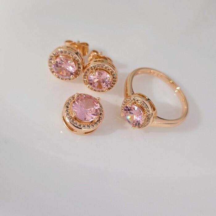 Комплект ювелирной бижутерии коллекция "Дубай"серьги, кулон и кольцо 17 р, покрытие позолота, вставка: фианиты, цвет: розовый и прозрачный, арт.313.258-17