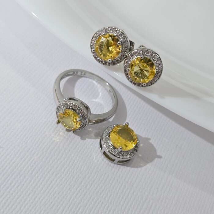 Комплект ювелирной бижутерии серьги, кулон и кольцо 17 р, покрытие посеребрение, вставка: фианиты, цвет: желтый и прозрачный, арт.313.254-17