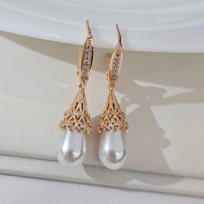Комплект ювелирная бижутерия коллекция  "Дубай" серьги и кольцо 19 р, покрытие: позолота, вставка: искусственный жемчуг и фианиты, цвет: прозрачный и жемчужный, арт.313.289-19 3 фото