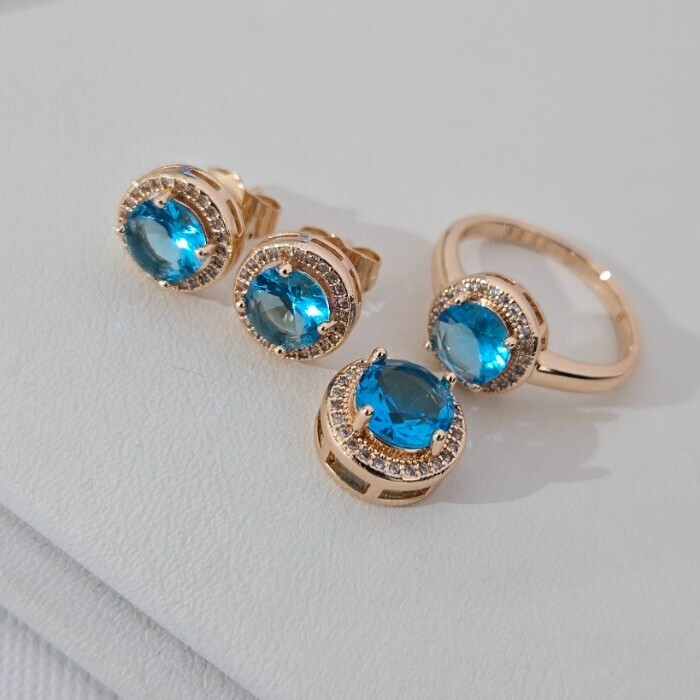 Комплект ювелирной бижутерии коллекция "Дубай"серьги, кулон и кольцо 17 р, покрытие позолота, вставка: фианиты, цвет: голубой и прозрачный, арт.313.263-17