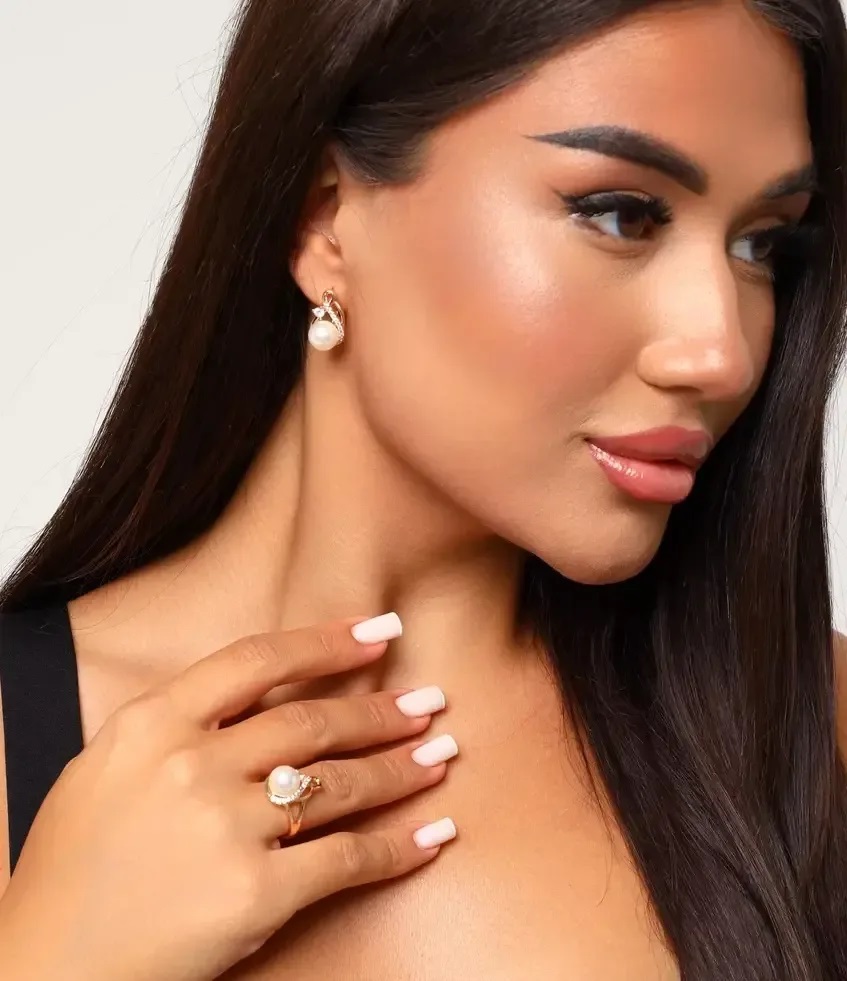 Комплект ювелирной бижутерии 19 р-р, коллекция "Дубай" серьги и кольцо, покрытие позолота, вставка: искусственный жемчуг, арт.214.638-19 4 фото
