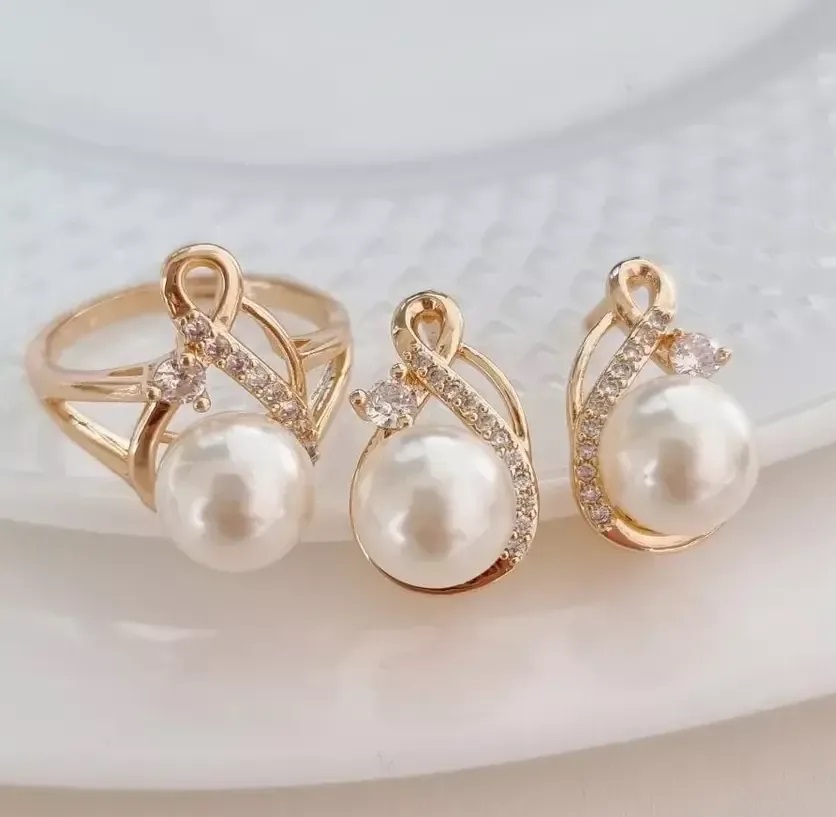 Комплект ювелирной бижутерии 18 р-р, коллекция "Дубай" серьги и кольцо, покрытие позолота, вставка: искусственный жемчуг, арт.214.638-18 4 фото