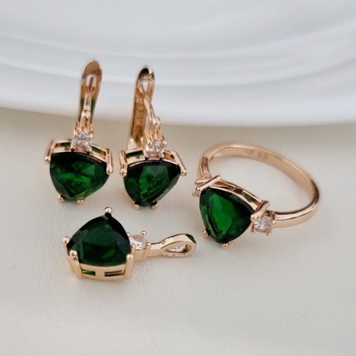 Комплект ювелирной бижутерии коллекция "Дубай" серьги, кулон и кольцо 17 р, покрытие позолота, вставка: фианиты, цвет: зеленый, арт.313.174-17 2 фото