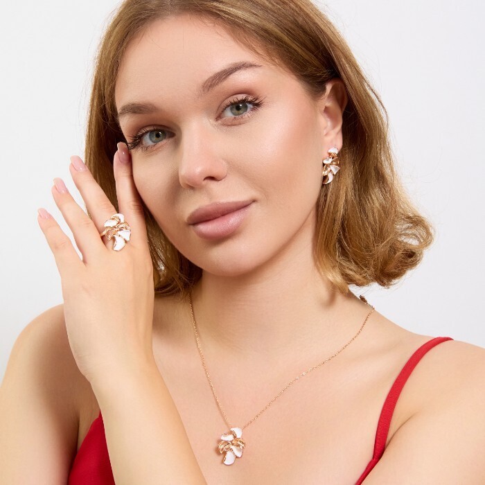 Комплект ювелирной бижутерии коллекция "Дубай" серьги, кулон и кольцо 18 р, покрытие позолота, вставка: матовая эмаль, цвет: белый, арт.313.170-18 2 фото