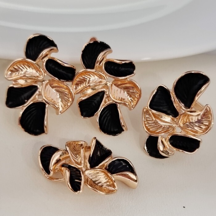 Комплект ювелирной бижутерии коллекция "Дубай" серьги, кулон и кольцо 17 р, покрытие позолота, вставка: матовая эмаль, цвет: черный, арт.313.169-17 2 фото