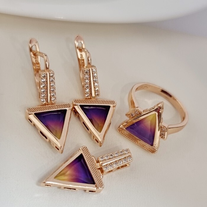 Комплект ювелирной бижутерии коллекция "Дубай" серьги, кулон и кольцо 17 р, покрытие позолота, вставка: фианиты, цвет: фиолетовый и желтый, арт.313.177-17 2 фото
