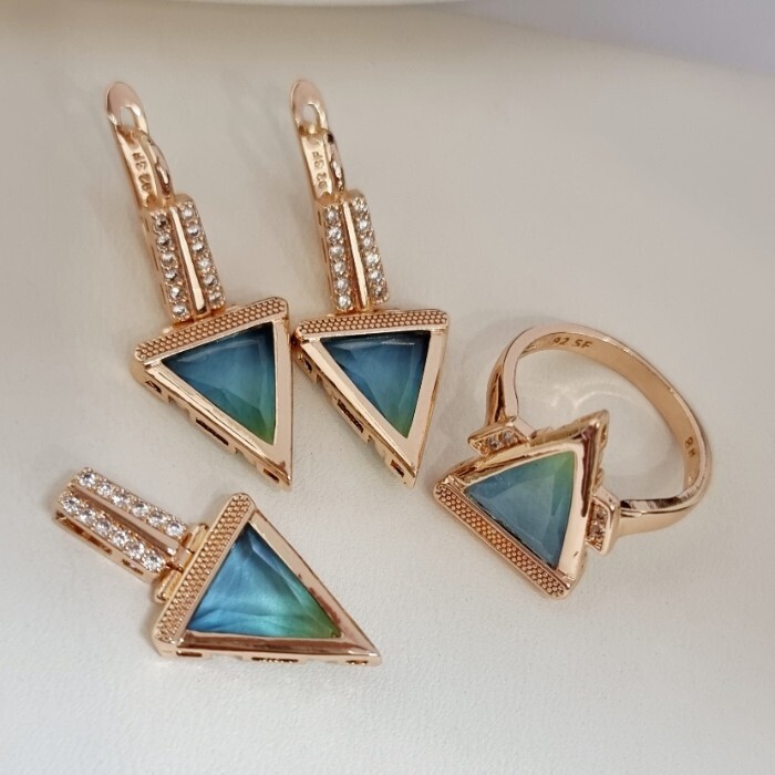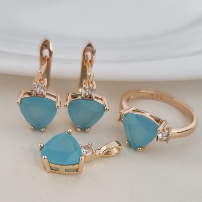 Комплект ювелирной бижутерии коллекция "Дубай" серьги, кулон и кольцо 17 р, покрытие позолота, вставка: фианиты, цвет: морская волна, арт.313.180-17 2 фото