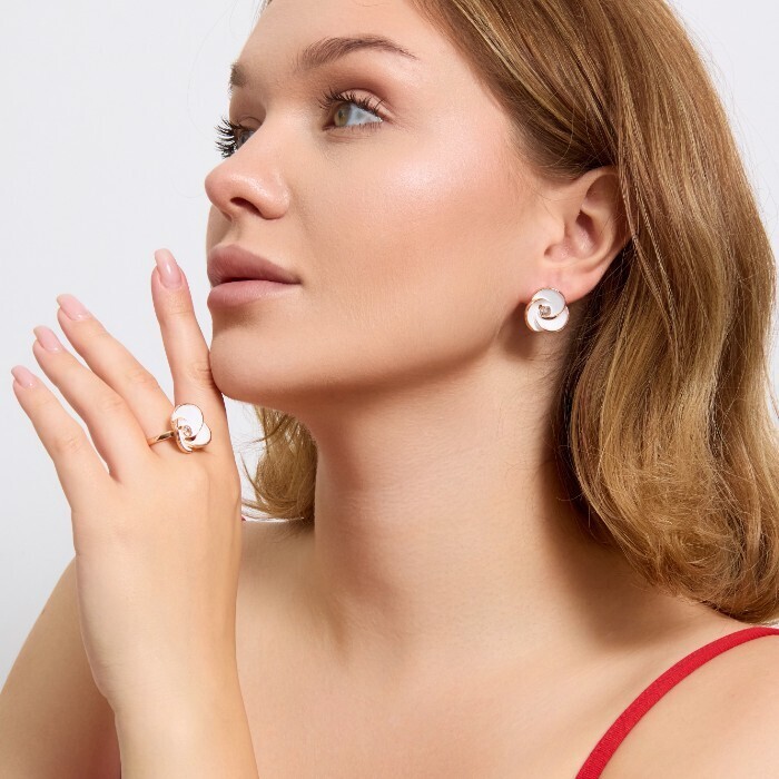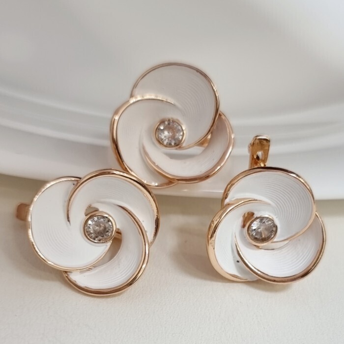 Комплект ювелирной бижутерии коллекция "Дубай" серьги и кольцо 19 р, покрытие позолота, вставка: матовая эмаль и фианит, цвет: белый и прозрачный, арт.313.168-19 2 фото