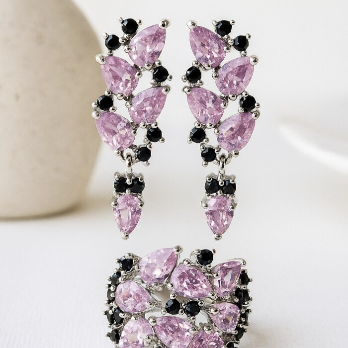 Комплект ювелирная бижутерия серьги и кольцо 18 р, покрытие: посеребрение, вставка: фианиты, цвет: розовый и черный, арт.313.032-18