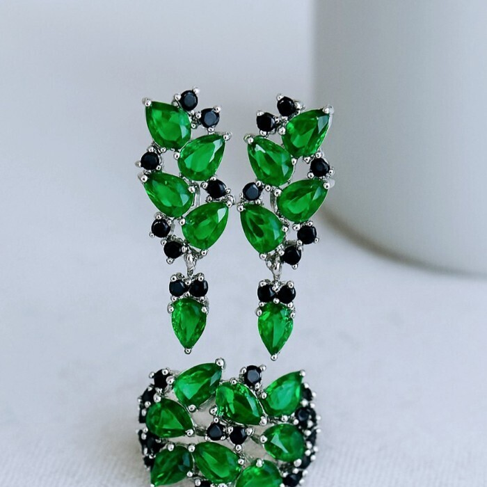 Комплект ювелирная бижутерия серьги и кольцо 17 р, покрытие: посеребрение, вставка: фианиты, цвет: зеленый и черный, арт.313.037-17