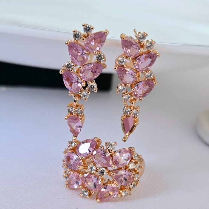 Комплект ювелирная бижутерия коллекция  "Дубай" серьги и кольцо 20 р, покрытие: позолота, вставка: фианиты, цвет: розовый и прозрачный, арт.313.040-20