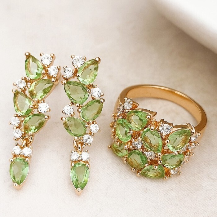 Комплект ювелирная бижутерия коллекция  "Дубай" серьги и кольцо 20 р, покрытие: позолота, вставка: фианиты, цвет: зеленый и прозрачный, арт.313.042-20