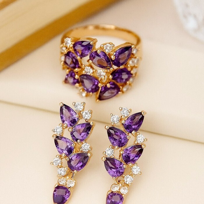 Комплект ювелирная бижутерия коллекция  "Дубай" серьги и кольцо 20 р, покрытие: позолота, вставка: фианиты, цвет: фиолетовый и прозрачный, арт.313.043-20