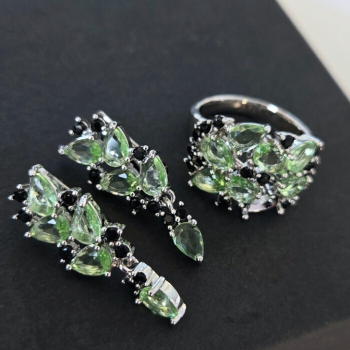 Комплект ювелирная бижутерия серьги и кольцо 20 р, покрытие: посеребрение, вставка: фианиты, цвет: зеленый и черный, арт.313.037-20