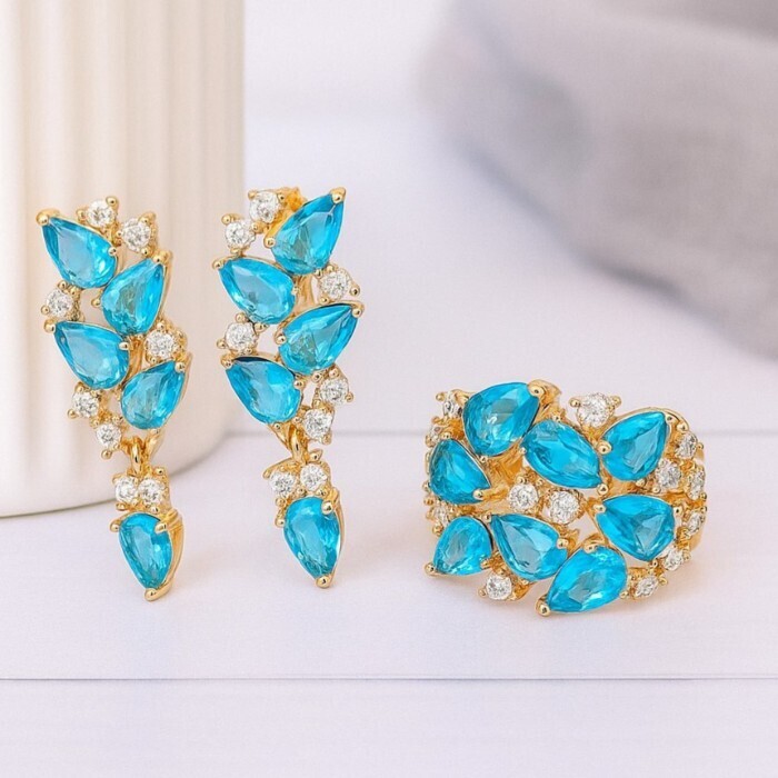Комплект ювелирная бижутерия коллекция  "Дубай" серьги и кольцо 18 р, покрытие: позолота, вставка: фианиты, цвет: голубой и прозрачный, арт.313.041-18