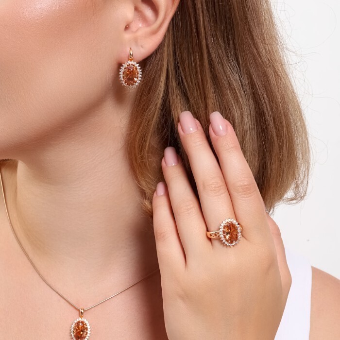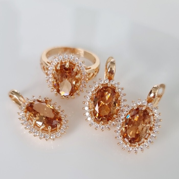 Комплект ювелирная бижутерия коллекция  "Дубай" серьги, кулон и кольцо 18 р, покрытие: позолота, вставка: фианит, цвет: бежевый и прозрачный, арт.313.095-18 2 фото