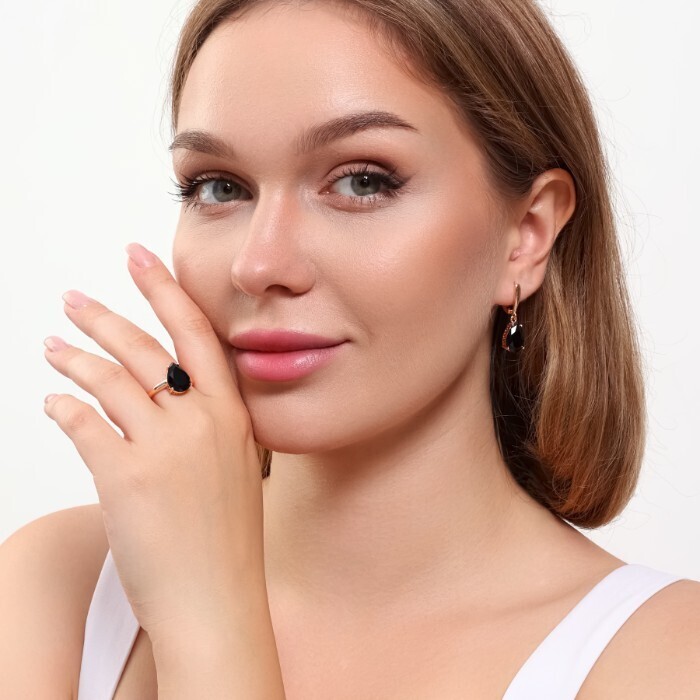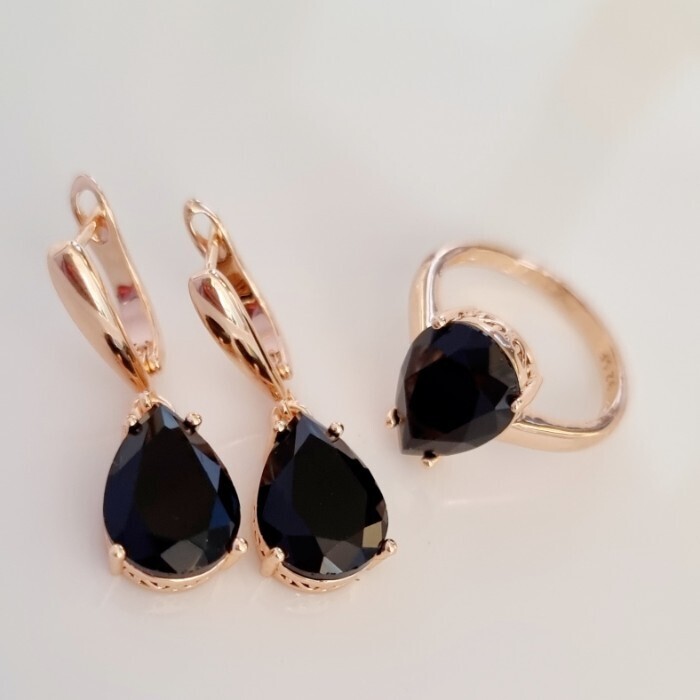 Комплект ювелирная бижутерия коллекция  "Дубай" серьги и кольцо 17 р, покрытие: позолота, вставка: фианит, цвет: черный, арт.313.085-17 2 фото