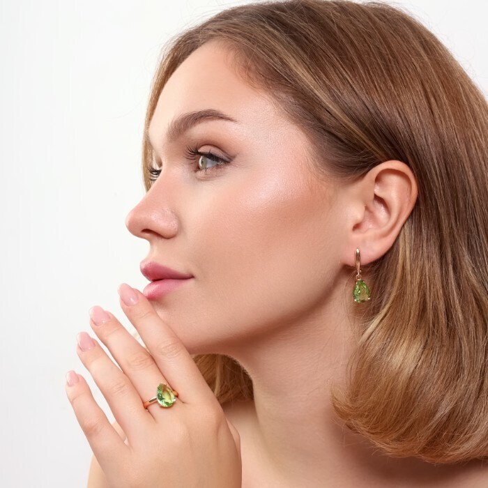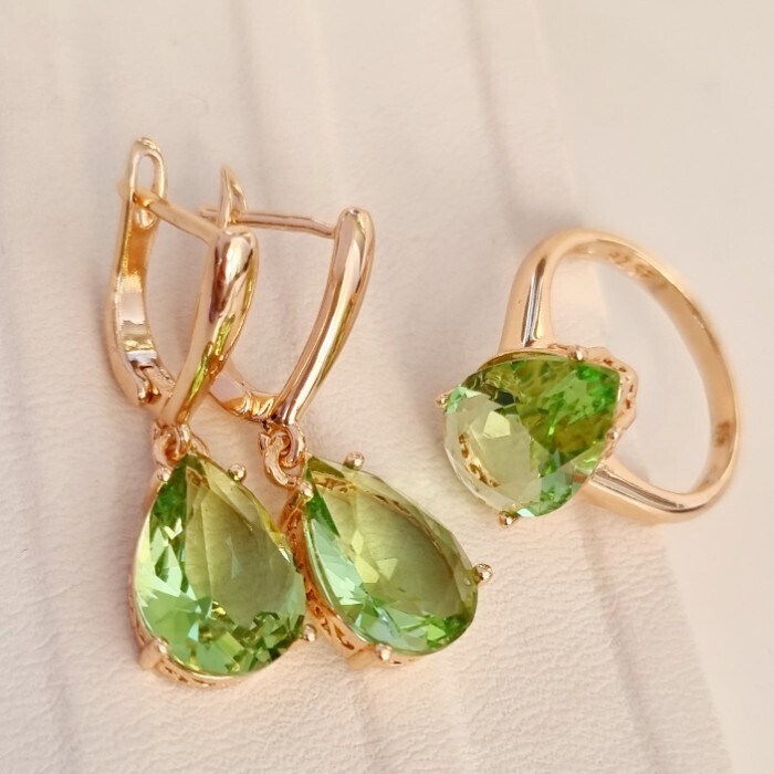 Комплект ювелирная бижутерия коллекция  "Дубай" серьги и кольцо 18 р, покрытие: позолота, вставка: фианит, цвет: бледно-зеленый, арт.313.091-18 2 фото