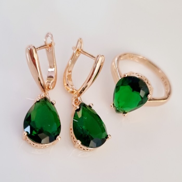Комплект ювелирная бижутерия коллекция  "Дубай" серьги и кольцо 18 р, покрытие: позолота, вставка: фианит, цвет: изумрудный, арт.313.088-18 2 фото