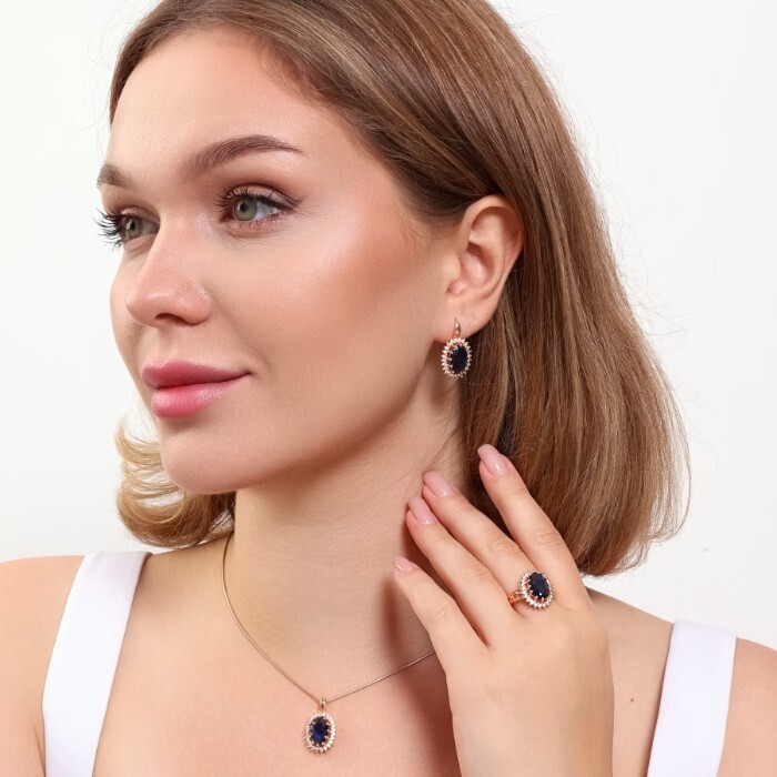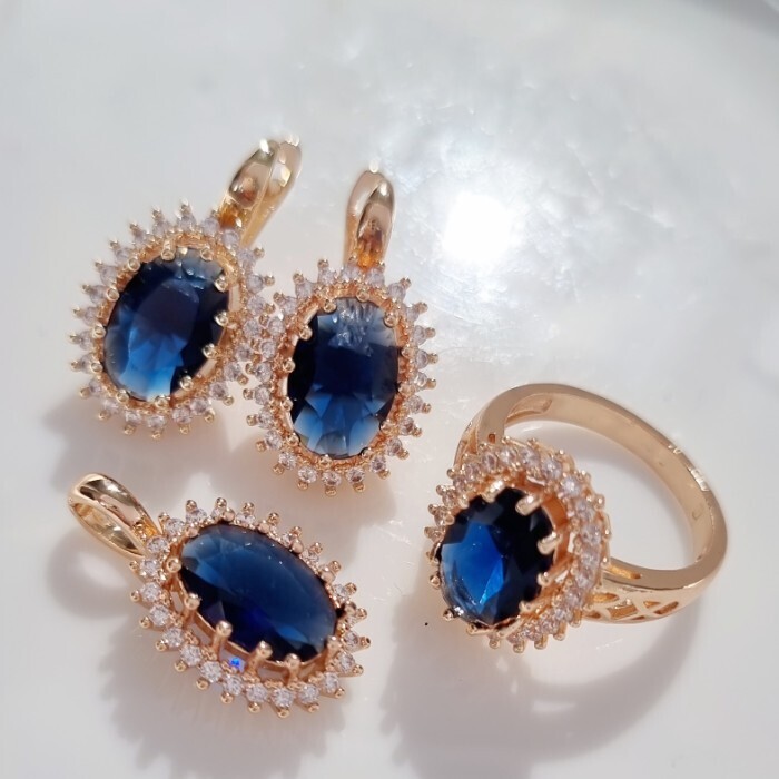 Комплект ювелирная бижутерия коллекция  "Дубай" серьги, кулон и кольцо 17 р, покрытие: позолота, вставка: фианит, цвет: синий и прозрачный, арт.313.097-17 2 фото